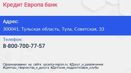 Кредит Европа банк по адресу 300041, Тульская область, Тула, Советская, 33 в дальнейшем Организация, размещена в следующих категориях: