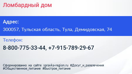 Ломбардный дом по адресу 300057, Тульская область, Тула, Демидовская, 74 в дальнейшем Организация, размещена в следующих категориях: