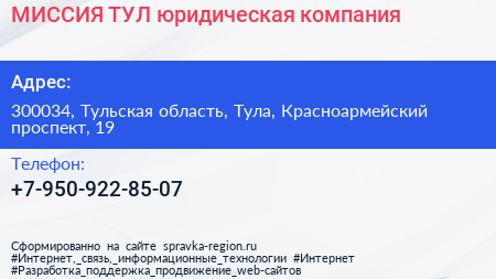 МИССИЯ ТУЛ, юридическая компания по адресу 300034, Тульская область, Тула, Красноармейский проспект, 19 в дальнейшем Организация, размещена в следующих категориях: