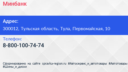 Минбанк по адресу 300012, Тульская область, Тула, Первомайская, 10 в дальнейшем Организация, размещена в следующих категориях: