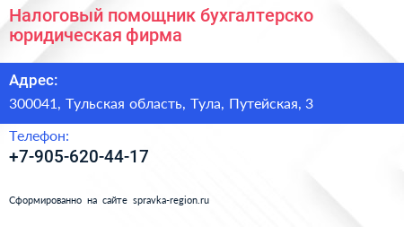 Налоговый помощник, бухгалтерско-юридическая фирма по адресу 300041, Тульская область, Тула, Путейская, 3 в дальнейшем Организация, размещена в следующих категориях: