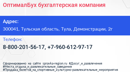 ОптималБух, бухгалтерская компания по адресу 300041, Тульская область, Тула, Демонстрации, 2г в дальнейшем Организация, размещена в следующих категориях:
