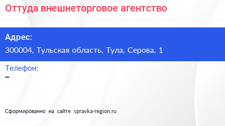 Оттуда, внешнеторговое агентство по адресу 300004, Тульская область, Тула, Серова, 1 в дальнейшем Организация, размещена в следующих категориях: