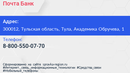 Почта Банк по адресу 300012, Тульская область, Тула, Академика Обручева, 1 в дальнейшем Организация, размещена в следующих категориях: