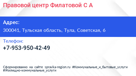 Правовой центр Филатовой С.А. по адресу 300041, Тульская область, Тула, Советская, 6 в дальнейшем Организация, размещена в следующих категориях: