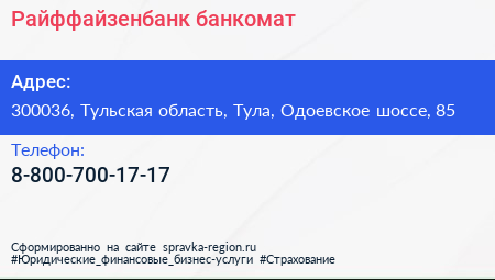 Райффайзенбанк, банкомат по адресу 300036, Тульская область, Тула, Одоевское шоссе, 85 в дальнейшем Организация, размещена в следующих категориях: