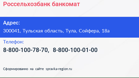 Россельхозбанк, банкомат по адресу 300041, Тульская область, Тула, Сойфера, 18а в дальнейшем Организация, размещена в следующих категориях: