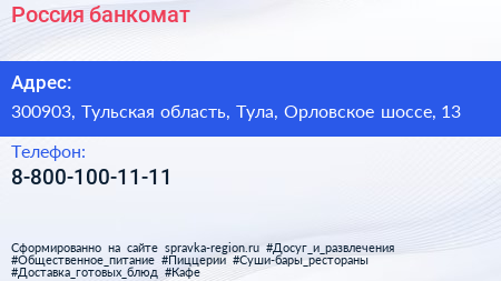 Россия, банкомат по адресу 300903, Тульская область, Тула, Орловское шоссе, 13 в дальнейшем Организация, размещена в следующих категориях: