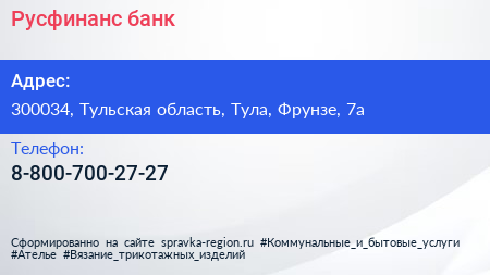 Русфинанс банк по адресу 300034, Тульская область, Тула, Фрунзе, 7а в дальнейшем Организация, размещена в следующих категориях: