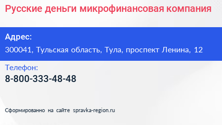 Русские деньги, микрофинансовая компания по адресу 300041, Тульская область, Тула, проспект Ленина, 12 в дальнейшем Организация, размещена в следующих категориях:
