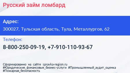 Русский займ, ломбард по адресу 300027, Тульская область, Тула, Металлургов, 62 в дальнейшем Организация, размещена в следующих категориях: