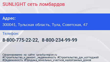 SUNLIGHT, сеть ломбардов по адресу 300041, Тульская область, Тула, Советская, 47 в дальнейшем Организация, размещена в следующих категориях: