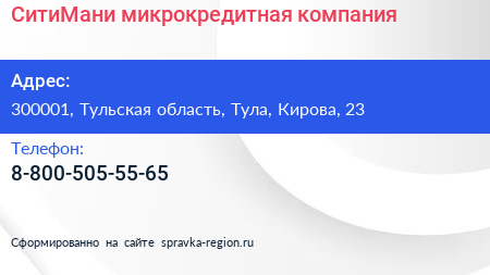 СитиМани, микрокредитная компания по адресу 300001, Тульская область, Тула, Кирова, 23 в дальнейшем Организация, размещена в следующих категориях: