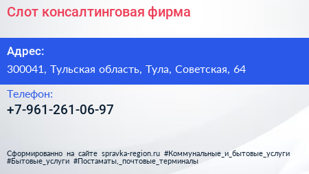 Слот, консалтинговая фирма по адресу 300041, Тульская область, Тула, Советская, 64 в дальнейшем Организация, размещена в следующих категориях: