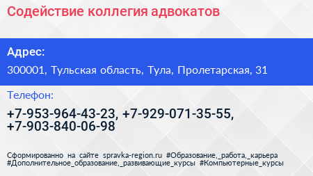 Содействие, коллегия адвокатов по адресу 300001, Тульская область, Тула, Пролетарская, 31 в дальнейшем Организация, размещена в следующих категориях: