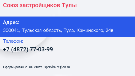 Союз застройщиков Тулы по адресу 300041, Тульская область, Тула, Каминского, 24в в дальнейшем Организация, размещена в следующих категориях: