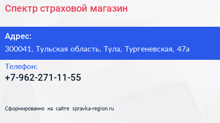 Спектр, страховой магазин по адресу 300041, Тульская область, Тула, Тургеневская, 47а в дальнейшем Организация, размещена в следующих категориях: