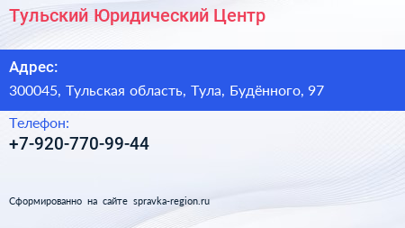 Тульский Юридический Центр по адресу 300045, Тульская область, Тула, Будённого, 97 в дальнейшем Организация, размещена в следующих категориях: