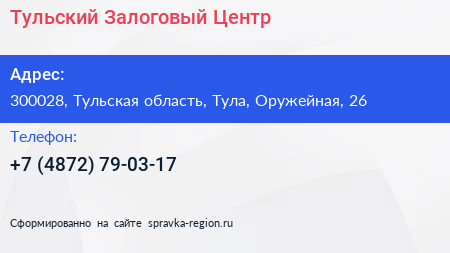 Тульский Залоговый Центр по адресу 300028, Тульская область, Тула, Оружейная, 26 в дальнейшем Организация, размещена в следующих категориях: