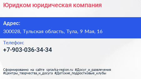Юридком, юридическая компания по адресу 300028, Тульская область, Тула, 9 Мая, 16 в дальнейшем Организация, размещена в следующих категориях: