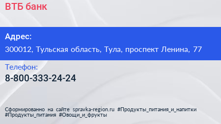 ВТБ, банк по адресу 300012, Тульская область, Тула, проспект Ленина, 77 в дальнейшем Организация, размещена в следующих категориях: