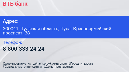 ВТБ, банк по адресу 300041, Тульская область, Тула, Красноармейский проспект, 38 в дальнейшем Организация, размещена в следующих категориях: