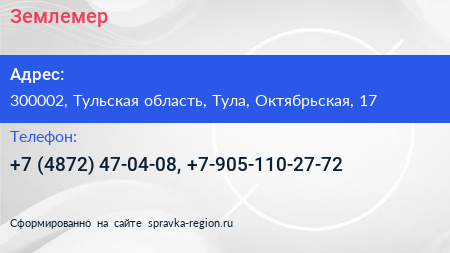 Землемер по адресу 300002, Тульская область, Тула, Октябрьская, 17 в дальнейшем Организация, размещена в следующих категориях: