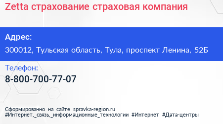 Zetta страхование, страховая компания по адресу 300012, Тульская область, Тула, проспект Ленина, 52Б в дальнейшем Организация, размещена в следующих категориях: