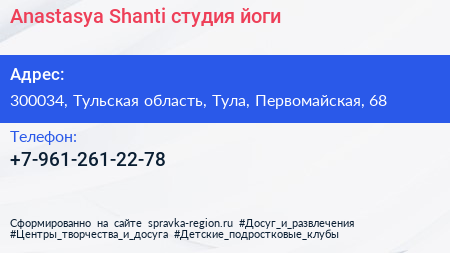 Anastasya Shanti, студия йоги по адресу 300034, Тульская область, Тула, Первомайская, 68 в дальнейшем Организация, размещена в следующих категориях: