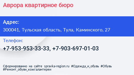 Аврора, квартирное бюро по адресу 300041, Тульская область, Тула, Каминского, 27 в дальнейшем Организация, размещена в следующих категориях: