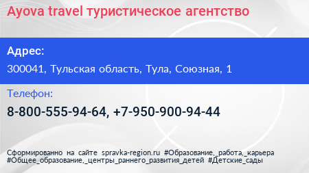 Ayova travel, туристическое агентство по адресу 300041, Тульская область, Тула, Союзная, 1 в дальнейшем Организация, размещена в следующих категориях: