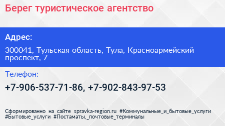 Берег, туристическое агентство по адресу 300041, Тульская область, Тула, Красноармейский проспект, 7 в дальнейшем Организация, размещена в следующих категориях: