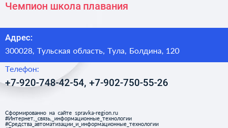 Чемпион, школа плавания по адресу 300028, Тульская область, Тула, Болдина, 120 в дальнейшем Организация, размещена в следующих категориях: