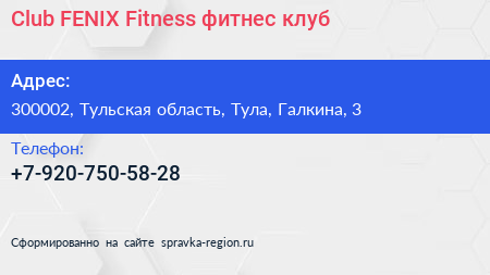 Club FENIX Fitness, фитнес-клуб по адресу 300002, Тульская область, Тула, Галкина, 3 в дальнейшем Организация, размещена в следующих категориях: