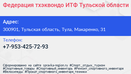 Федерация тхэквондо (ИТФ) Тульской области по адресу 300901, Тульская область, Тула, Макаренко, 31 в дальнейшем Организация, размещена в следующих категориях: