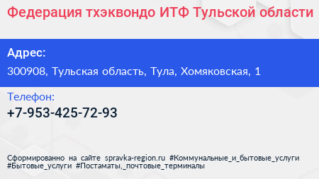 Федерация тхэквондо (ИТФ) Тульской области по адресу 300908, Тульская область, Тула, Хомяковская, 1 в дальнейшем Организация, размещена в следующих категориях:
