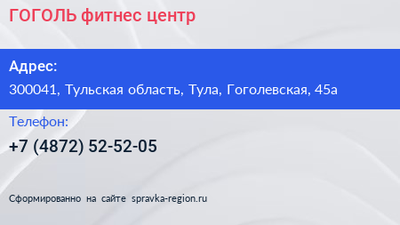 ГОГОЛЬ, фитнес-центр по адресу 300041, Тульская область, Тула, Гоголевская, 45а в дальнейшем Организация, размещена в следующих категориях: