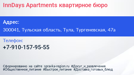InnDays Apartments, квартирное бюро по адресу 300041, Тульская область, Тула, Тургеневская, 47а в дальнейшем Организация, размещена в следующих категориях: