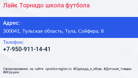 Лайк & Торнадо, школа футбола по адресу 300041, Тульская область, Тула, Сойфера, 8 в дальнейшем Организация, размещена в следующих категориях: