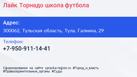 Лайк & Торнадо, школа футбола по адресу 300062, Тульская область, Тула, Галкина, 29 в дальнейшем Организация, размещена в следующих категориях: