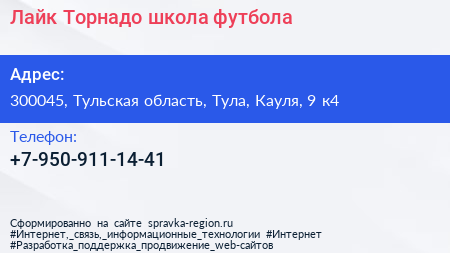 Лайк & Торнадо, школа футбола по адресу 300045, Тульская область, Тула, Кауля, 9 к4 в дальнейшем Организация, размещена в следующих категориях: