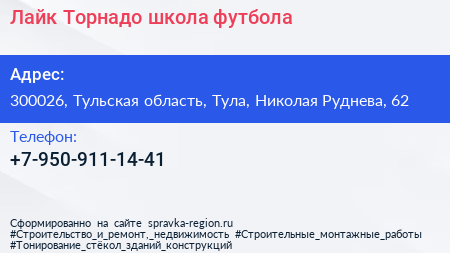 Лайк & Торнадо, школа футбола по адресу 300026, Тульская область, Тула, Николая Руднева, 62 в дальнейшем Организация, размещена в следующих категориях: