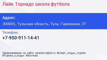 Лайк & Торнадо, школа футбола по адресу 300001, Тульская область, Тула, Гармонная, 37 в дальнейшем Организация, размещена в следующих категориях: