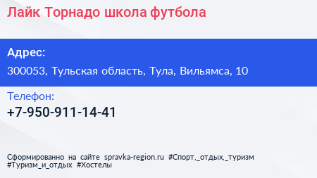 Лайк & Торнадо, школа футбола по адресу 300053, Тульская область, Тула, Вильямса, 10 в дальнейшем Организация, размещена в следующих категориях: