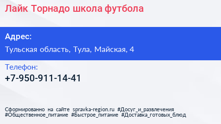Лайк & Торнадо, школа футбола по адресу Тульская область, Тула, Майская, 4 в дальнейшем Организация, размещена в следующих категориях:
