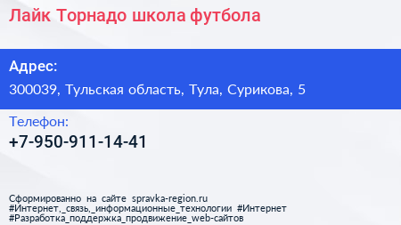 Лайк & Торнадо, школа футбола по адресу 300039, Тульская область, Тула, Сурикова, 5 в дальнейшем Организация, размещена в следующих категориях: