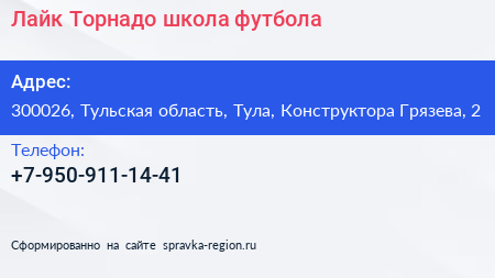 Лайк & Торнадо, школа футбола по адресу 300026, Тульская область, Тула, Конструктора Грязева, 2 в дальнейшем Организация, размещена в следующих категориях: