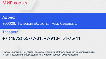 МИГ, хостел по адресу 300028, Тульская область, Тула, Седова, 1 в дальнейшем Организация, размещена в следующих категориях: