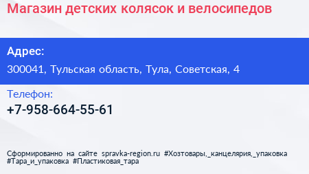 Магазин детских колясок и велосипедов по адресу 300041, Тульская область, Тула, Советская, 4 в дальнейшем Организация, размещена в следующих категориях: