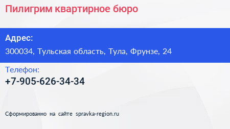 Пилигрим, квартирное бюро по адресу 300034, Тульская область, Тула, Фрунзе, 24 в дальнейшем Организация, размещена в следующих категориях: